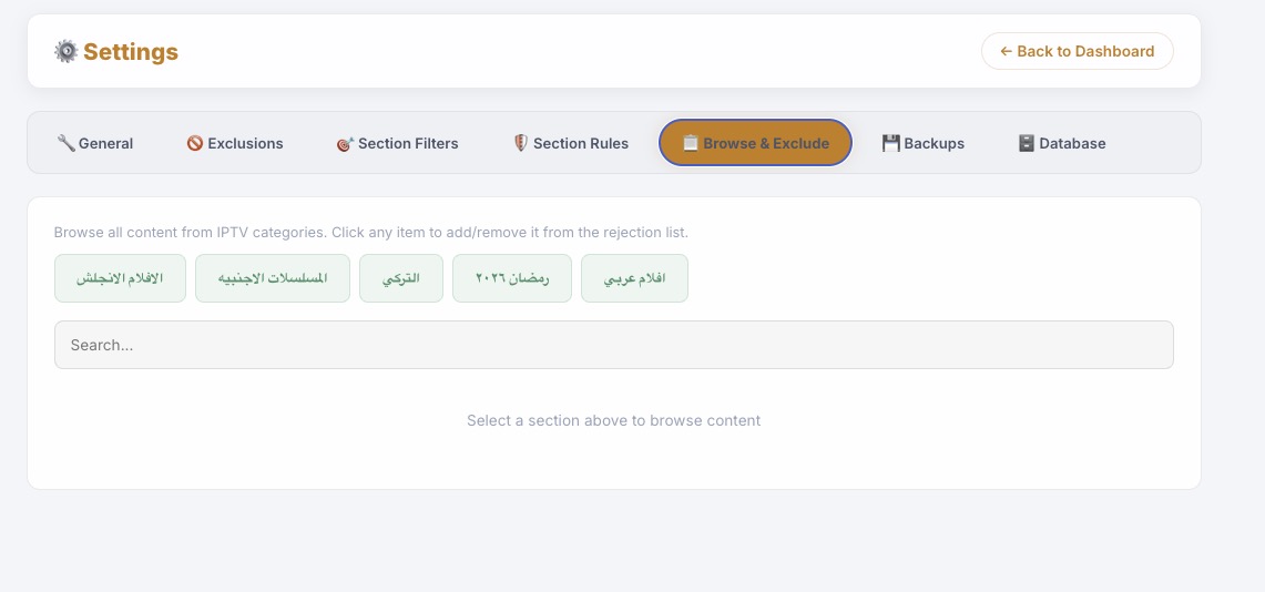 | Browse & Exclude | Visual provider browser for rejecting or excluding items from settings | تصفح مرئي لمحتوى المزود والاستبعاد من داخل الإعدادات |