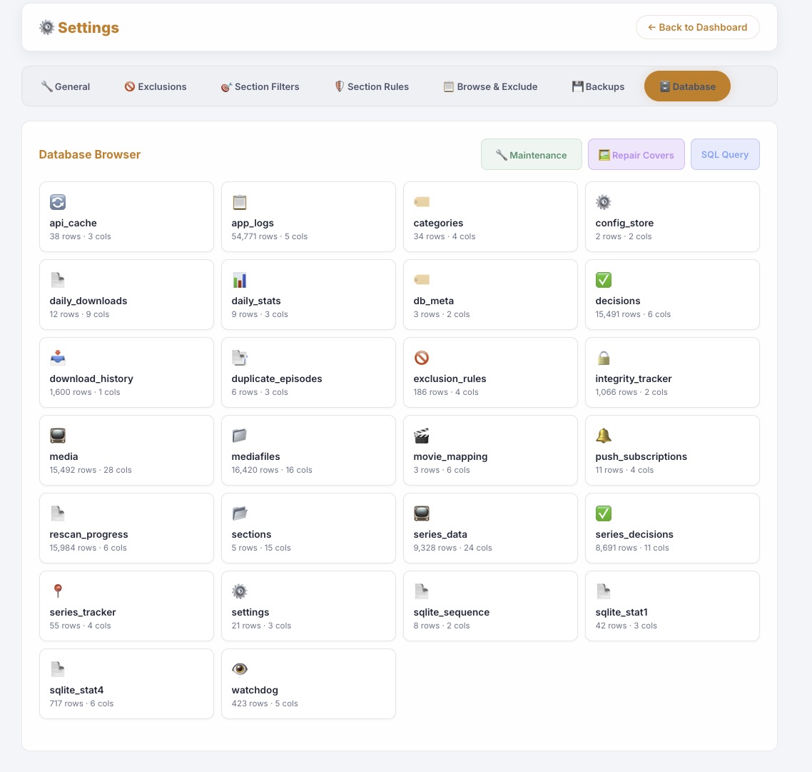 | SQLite WAL | Media, decisions, sections, categories, downloads, watch state, trash, logs, telemetry, settings |