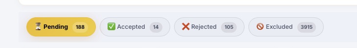 شريط الحالات يقسم دورة العمل: معلق، مقبول، مرفوض، مستبعد، وتابات مراجعة إضافية مع أعداد حية وفلاتر دقيقة.