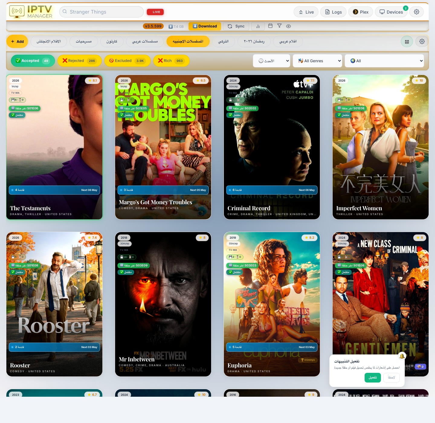 مدير IPTV شامل لـ Plex والتنزيل والمتابعة والتشغيل المحلي