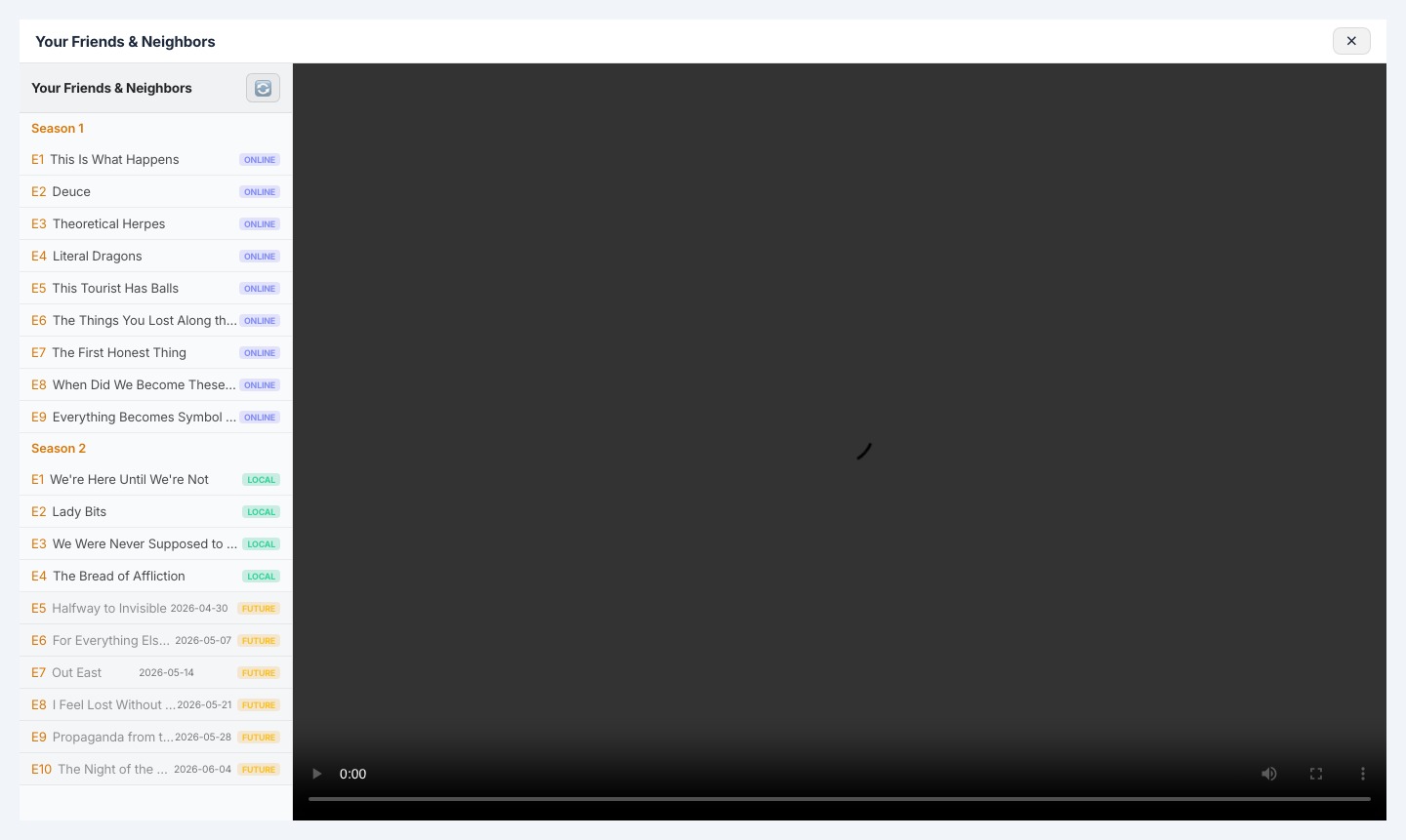 عرض حلقات VOD يميز بين المحلي، الأونلاين، الناقص، المشاهد، والمستقبلي في قائمة واحدة.