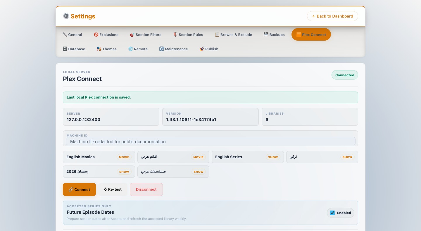 | Plex Connect | Connect, re-test, disconnect, library discovery, user refresh, per-section interest, and future episode date toggle | ربط Plex، إعادة اختبار، اكتشاف المكتبات، تحديث المستخدمين، اهتمام المستخدم بكل قسم، وتفعيل مواعيد الحلقات القادمة |