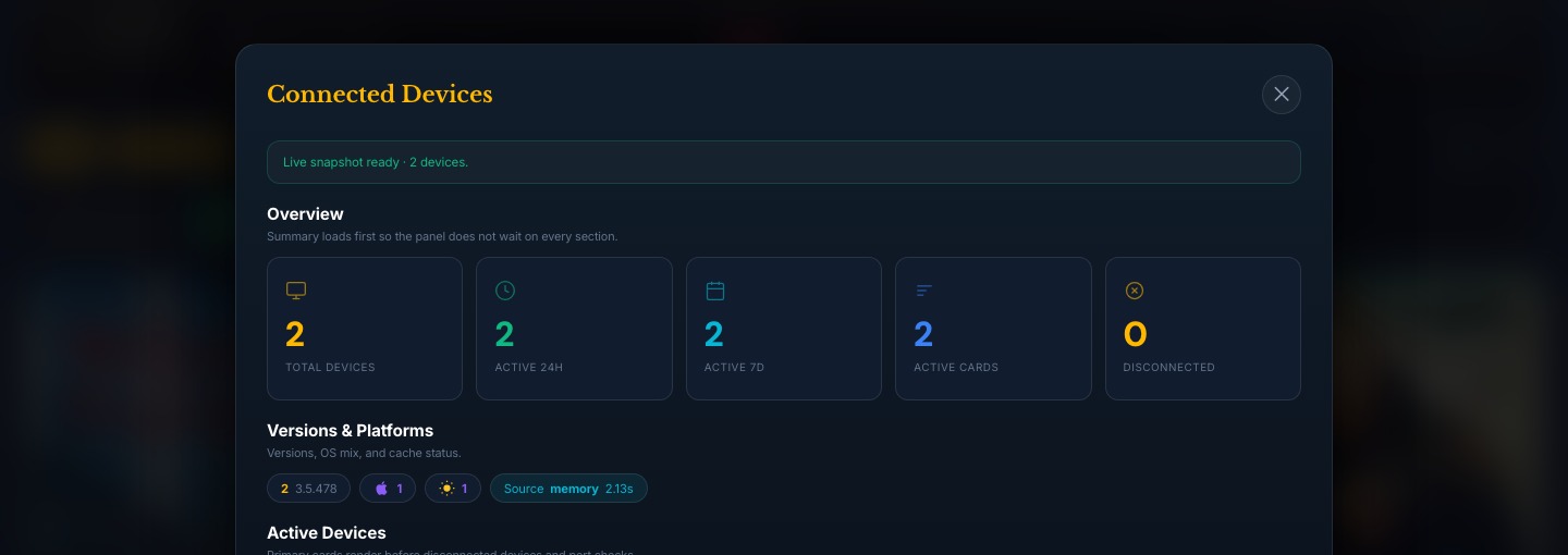 The Connected Devices panel summarizes client health, versions, active/disconnected counts, update state, and repair readiness.