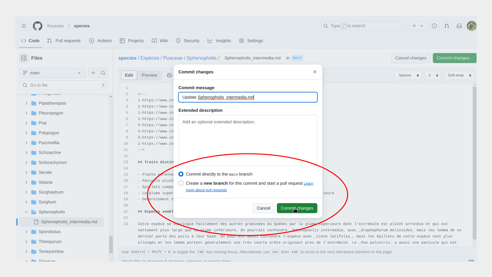 Lors de l'édition d'un compte-rendu, assurez-vous que vous êtes bien sur la fork de votre compte GitHub et non sur le compte de Flore Québec (voir en haut en gauche).