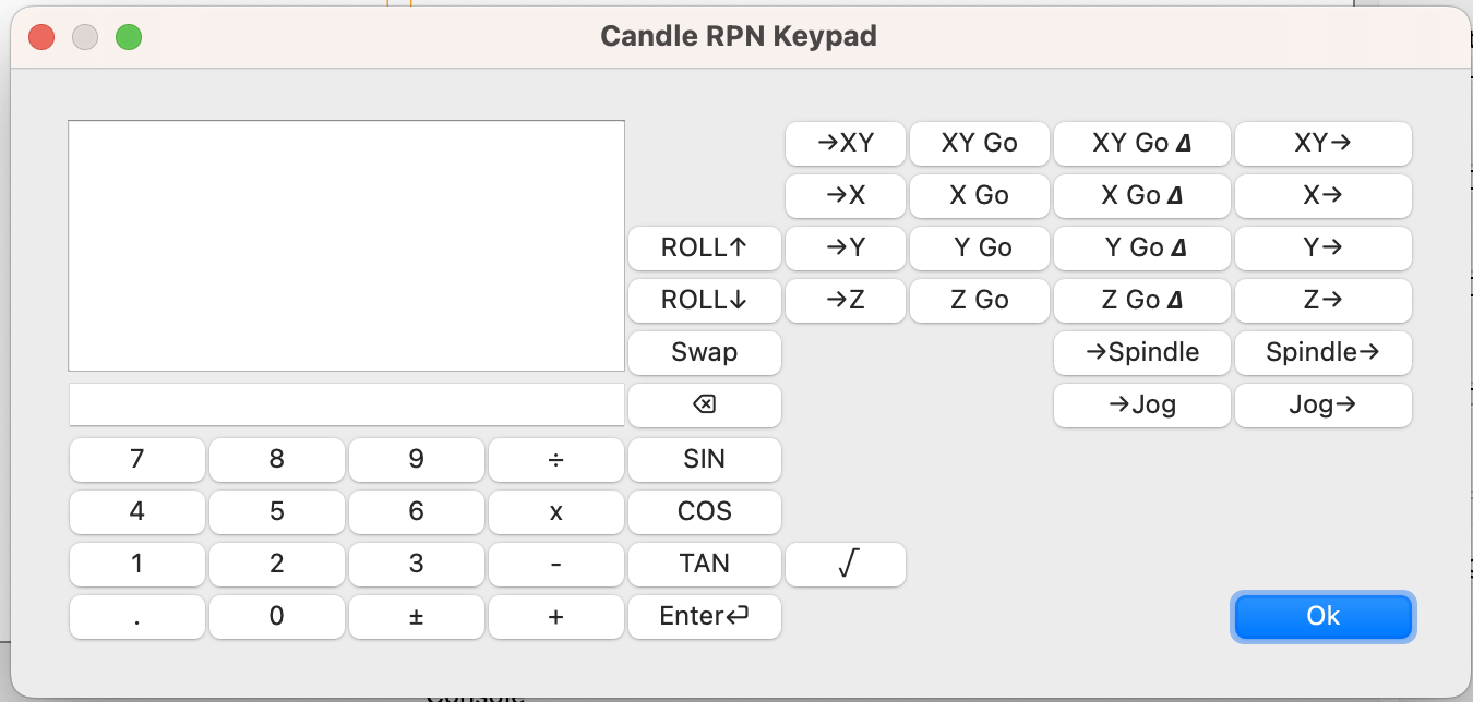 The RPN keypad is inspired by the cncjs "shopfloor tablet" UI. This version has the RPN Calculator, but also allows you to perform the following operations on each of the X, Y, or Z axis, as well as the XY axis (pops two numbers from the stack):