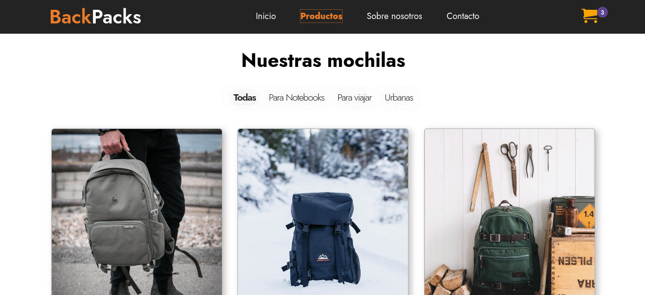 En la página se va a poder los productos estan filtrados por categorias, se pueden ver las mochilas urbanas, mochilas para notebook y mochilas para viajar, ademas de poder ver todas las mochilas. Siguiendo con el flujo se puede ingresar al detalle de un producto, desde ahi seleccionar la cantidad de productos a comprar y finalizar la compra o seguir comprando. Si se seleccionar finalizar la compra nos dirige al carrito, desde el carrito al finalizar la compra se debe completar un formulario para terminar con la compra.
