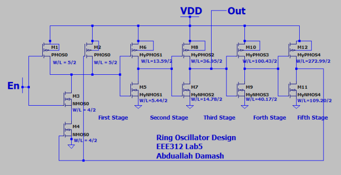 A. An enabled ring oscillator circuit design and analysis, which will be utilized to extract a Delay Correlation Factor and Input Capacitance for reference inverter propagation delayestimates in a given 2μm technology node, using simple analytical models.