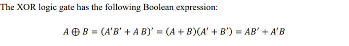 The expression for the XOR gate is what we will use to build the pull-down network, and the second expression is used to build the pull up network. The third expression is the simplified expression for the XOR operation.