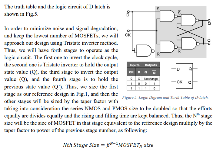 as seen in Fig.1. Then, we need to size the first stage which is the NAND gate using worst path methodology. After that, since the rest stages are cascade inverter, we need to use the optimal value of taper factor as 𝛽𝑂𝑡𝑚 ≈ 𝑒 and scale the other stage accordingly so that the propagation delay remains balanced. Also, for low-cost consideration, the design will consider the lowest number of MOSFET and try to minimize the utilization area by using the optimal value of taper factor.