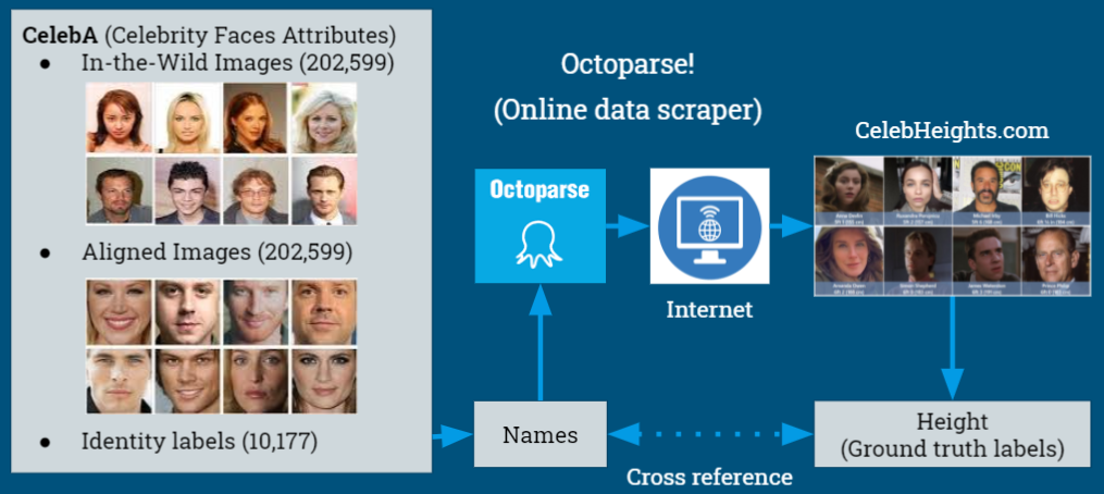 The next step was to find the height labels of these faces. The website celebheights.com has the height information of 13059 celebrities. It would be an arduous task if we were to manually record and label these heights to the CelebA dataset, thus we use the tool OctoParse to automatically parse the whole website into a list of celebrity name - height pairs. Since we had the image - celebrity name pair on the CelebA side and the celebrity name - height pair on the other, we wrote a script to match this information together. In the end we were able to get the height data of 3671 celebrities and 82453 images in the CelebA dataset, a decent amount to train a network.