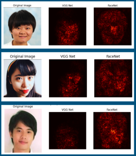 Saliency map analysis is to visualize the gradients of the back-propagated losses of all spatial locations of the input image, in order to determine locations with larger gradients, or in other words, to figure out what does the network focuses on. We compared saliency maps from both VGG and FaceNet/VGGFace2 backbones, with our original photos, in the following figure. From the results we can observe that the VGG saliency maps tend to overlap with the "brighter" areas in the image, this is probably because it was trained on and aiming to generalize across a large variety of images. On the other hand, the FaceNet, which is trained on facial images, produces saliency maps that are able to capture the entire contour of the person in the image (head, hair, etc.) and have the largest gradients on significant facial characteristics (such as the nose or mouth). This shows that FaceNet better encodes and is more aware of facial features.