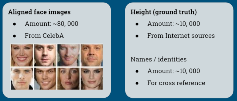 The "Show me your face and I will tell you your height, weight, and body mass index" [2] research also had a celebrity face and labeled height dataset of size 1026, and we were able to contact the author to acquire it. Although the dataset isn't large compared to what we already have, we still added these image - height pairs to our data.