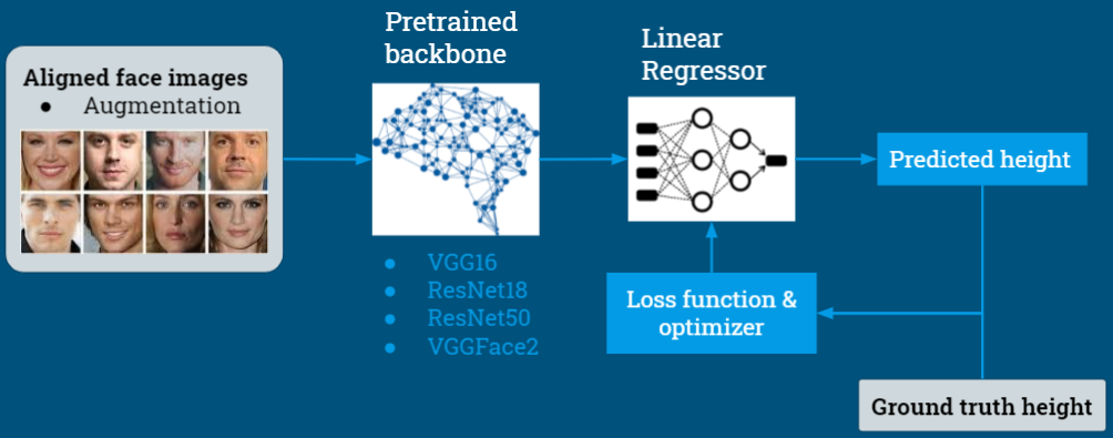Our neural network consists of two parts, the pretrained backbone and the classifier. The classifier is composed of several linear layers, of which the last layer has only one output neuron. The overall network architecture is shown in the diagram below. During both training and testing phases, we pass the aligned, augmented face images through the pretrained backbone, followed by the classifier. The final layer of the classifier produces a scalar "score", which is actually the height prediction of the person in the input image. After having the height prediction of an instance, we compare it to the ground truth height, and use the mean square error (MSE) as our loss function: