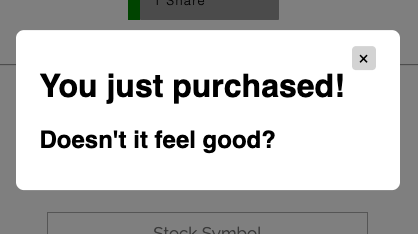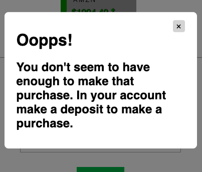 When attempting to make a purchase a user will be presented with a popup modal in one of two instances. One being a successful purchase, the other being when the balance cannot cover a purchase amount.