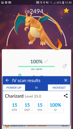 Individual Values or 'IVs' are stats that determine how much extra power a Pokémon has in addition to the baseline (0% IV). IVs consists of Attack (affects damage of moves), Defense (affects amount of damage received) and Stamina (affects the amount of HP). IVs are calculated using Pokémon level, CP and HP, using these information we are able to calculate the possible IVs for the Pokémon. IVs are fixed and do not change when powering up or evolving, and multiple power up may help in getting. The higher the IVs, the more Combat Points (CP) the Pokémon will have, compared to another Pokémon of the same species & level. For example, the base stats of a pokemon could be 100 attack, 100 defence, and 100 stamina. That would mean that all pokemon of that species has at least 100 in each stat, but with added bonuses, could have up to 115 of all stats. A perfect IV species would therefor have 115 attack, 115 defence, and 115 stamina.