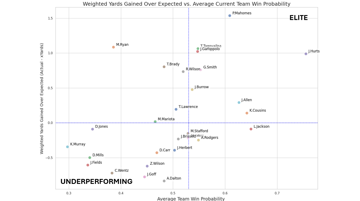Figure 5: Scatter plot with quadrants illustrating all passers, plotted on the y-axis as Yards Gained Over Expectation (YGoE) against the x-axis as Average Team Win Probability.We set out to determine if YGoE correlates with winning probability for passers. Figure 5 shows the YGoE vs. the Average Team Winning Probability for all passers who registered 150 plays through Weeks 1-9 in the 2022 NFL season. Incompletions disproportionately penalize a QB's YGoE as their number of passing attempts increases, so a quadratic adjustment factor is used to normalize this effect.
