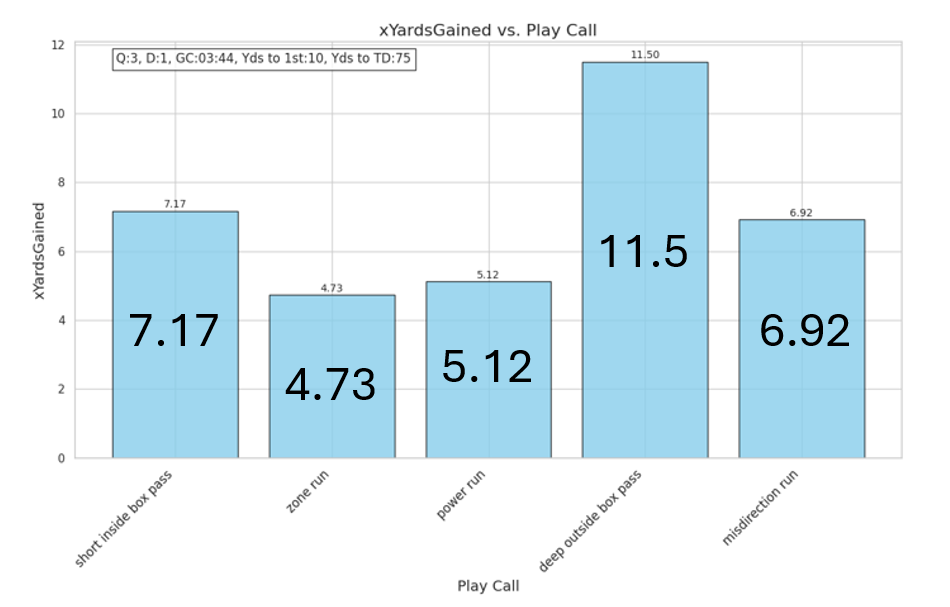 - Expected Yards Gained (xYards): The predicted yardage that will likely be achieved based on the specific play context and play call.