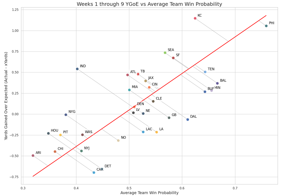 Figure 6: Projection of the Yards Gained over Expected (YGoE) vs. Average Team Win Probability of all teams onto the line of perfect correlation for Weeks 1 through 9.Data points lying above the line of perfect correlation represent teams that are outperforming their record, indicating that their YGoE exceeds what would typically be expected given their win probability. Conversely, teams below this line are underperforming, suggesting that their YGoE is lagging behind expectations. This approach offers an assessment of team efficiency and potential beyond mere win-loss records.