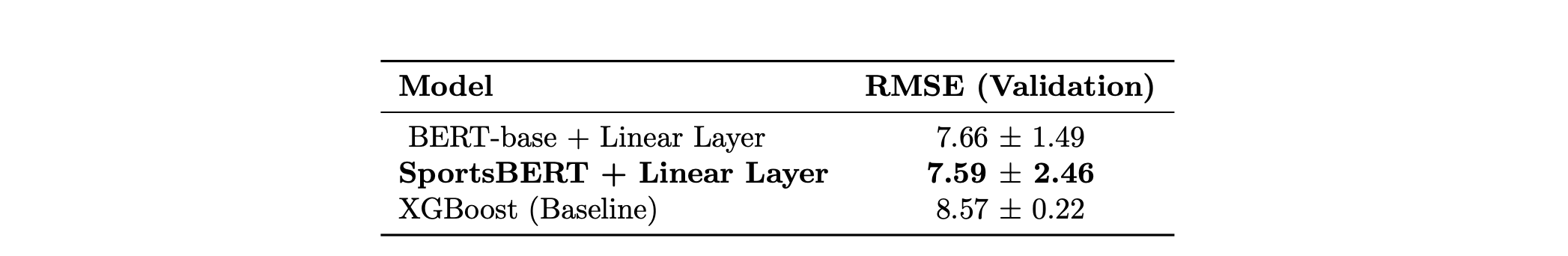 Table 1: Model performance comparison on the validation set. RMSE and standard deviation values are in yards.The ground truth validation data contains some variation in the yardsGained labels, covering a standard deviation of 8.69 yards. All three models achieved RMSE values within one standard deviation bound, providing some validity to their performance. The SportsBERT regressor demonstrated the lowest RMSE in xYards predicted compared to the base BERT model and the XGBoost baseline. Consequently, in subsequent experiments the SportsBERT variant of the model was used.