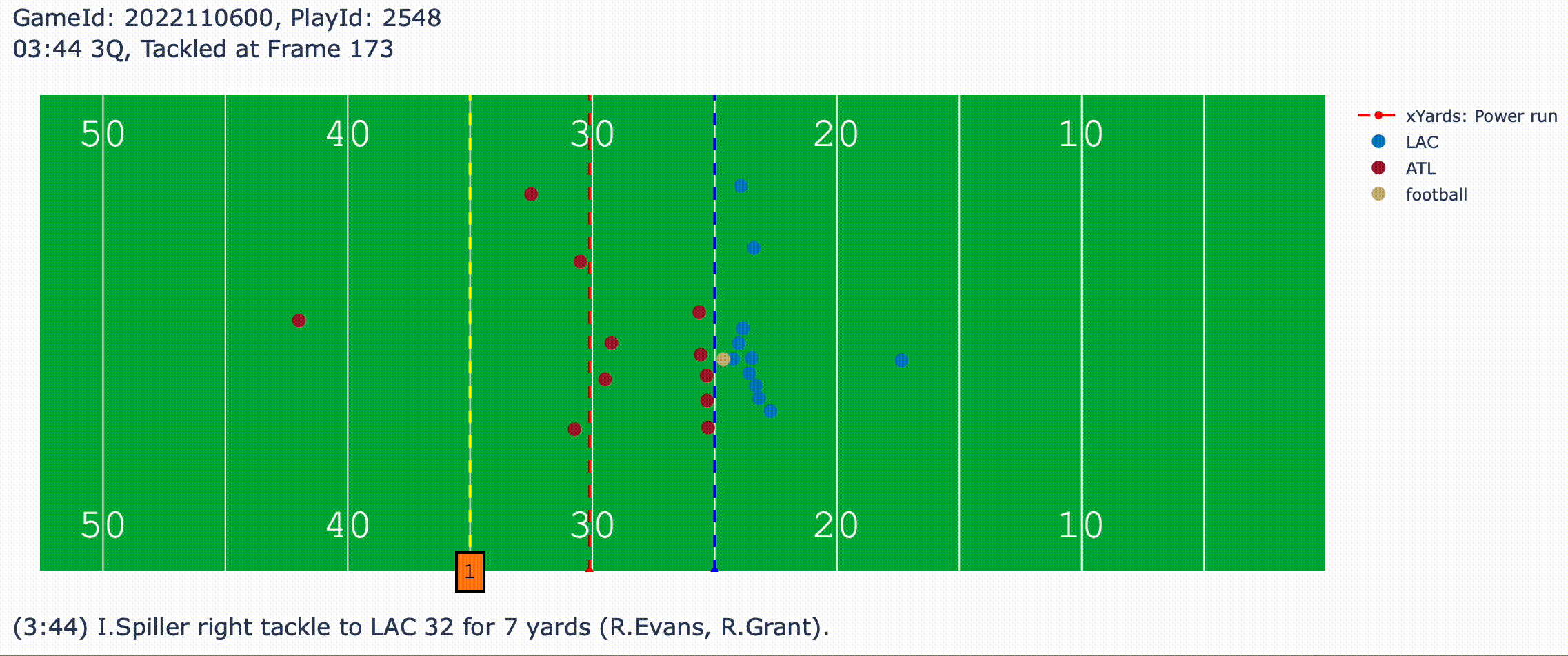 From this context, the xPassRush model predicts that the play, a power run, will result in a gain of 5.12 yards as indicated by the red marker on the field. Isaiah Spiller takes the ball and rushes for 7 yards, for which he would be credited with 2 Yards Gained over Expected (YGoE) for this play.