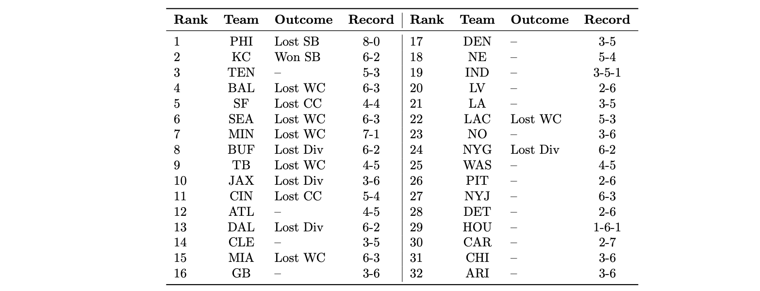 Table 3: Team rankings after Week 9 of the 2022 NFL Season. Postseason outcomes are indicated where applicable: SB (Super Bowl), CC (Conference Championship), Div (Divisional Round), WC (Wild Card), -- (No Playoffs). The "Record" column reflects the team's record at the end of Week 9.Our model demonstrated strong predictive capabilities, accurately ranking the two Super Bowl finalists as the top two teams (Philadelphia Eagles and Kansas City Chiefs). While the Minnesota Vikings held a 7-1 record, our model ranked them 7th, correctly anticipating their Wild Card exit. Similarly, the Jacksonville Jaguars, despite a 3-6 record, were ranked 10th and advanced to the Divisional Round, and San Francisco, at 4-4, was ranked 5th, aligning with their Conference Championship run. Notably, the model ranked the 6-3 New York Jets at 27th, reflecting skepticism validated by their failure to make the playoffs.