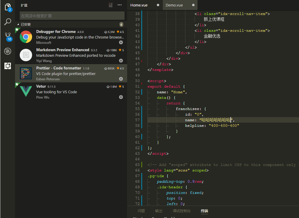 - 补充下,以上的前提是各位的VScode都已经安装了 vetur 扩展。这个相信用 vscode 写 vue 的小伙伴们大部分都知道是干嘛的,就不再过多介绍了。