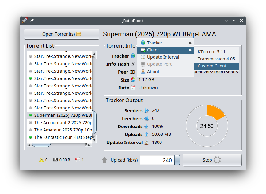 - spoofs multiple torrent clients (kTorrent, Transmission, uTorrent and more) choose any version number for any of them !