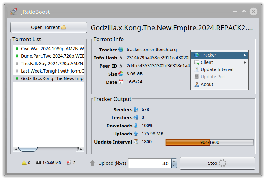 JRatioBoost is now at version 2.1. It is used to spoof uploads to private torrent trackers. It will simply report to the torrent tracker that you are uploading, when you are really uploading nothing at all. This will give you a good "ratio" on any private tracker that you use. It will work on any major operating system as long as Java is installed on that system.