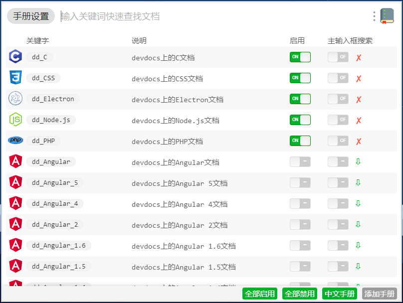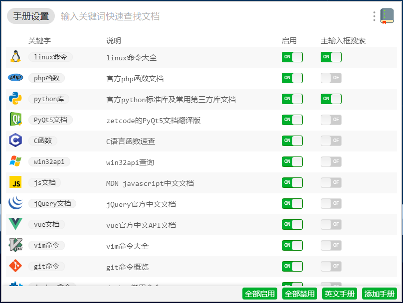 手册设置/ManualOptions: 调整程序员手册的功能dash/zeal:打开dash 或 zeal 进行搜索linux命令php函数python库C函数win32apivim命令git命令docker命令sql手册uToolsAPI等