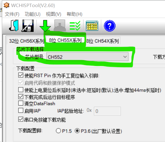 4、打开WCHISPTool工具,选择8位 CH55X系列,芯片型号选择CH552(如果是CH554选择CH554)。