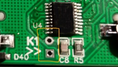 2、不要接入USB,不需要取下电池,找到如下图中PCB上标识为K1的两个通孔焊盘(位置和标识样式可能会有所不同,但是肯定是叫K1),然后短接这两个焊盘。