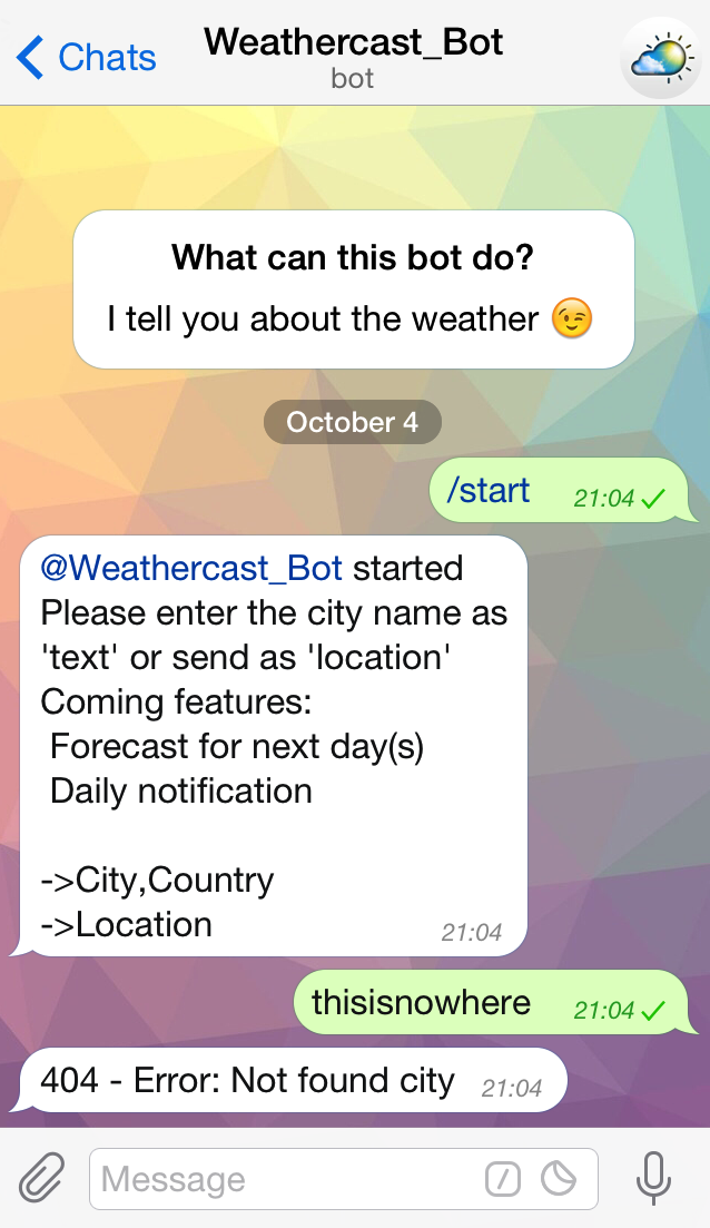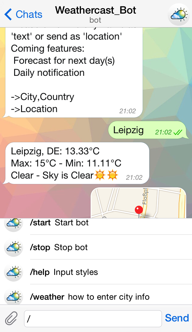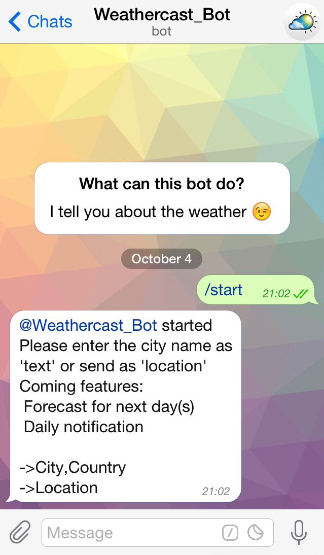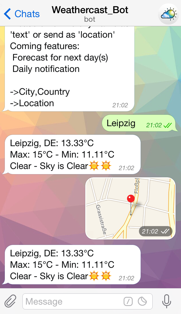 This Telegram Bot takes user's location as text or GPS coordinates and then informs about its current weather-cast.
