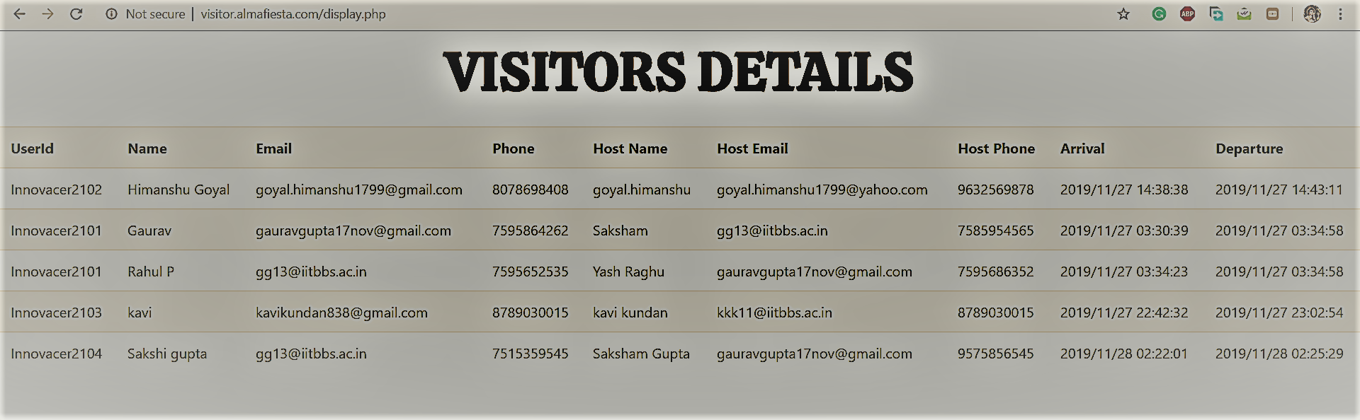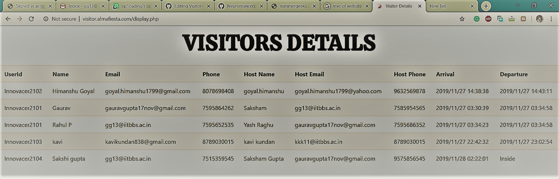 I created a php page to fetch data from the MySQl database which will show visitors details along with who is inside. This page can only be viewed by manager or Authorised persons. I have kept its Url different http://visitor.almafiesta.com/display.php , We can also keep a Authorisation system also to access this page.