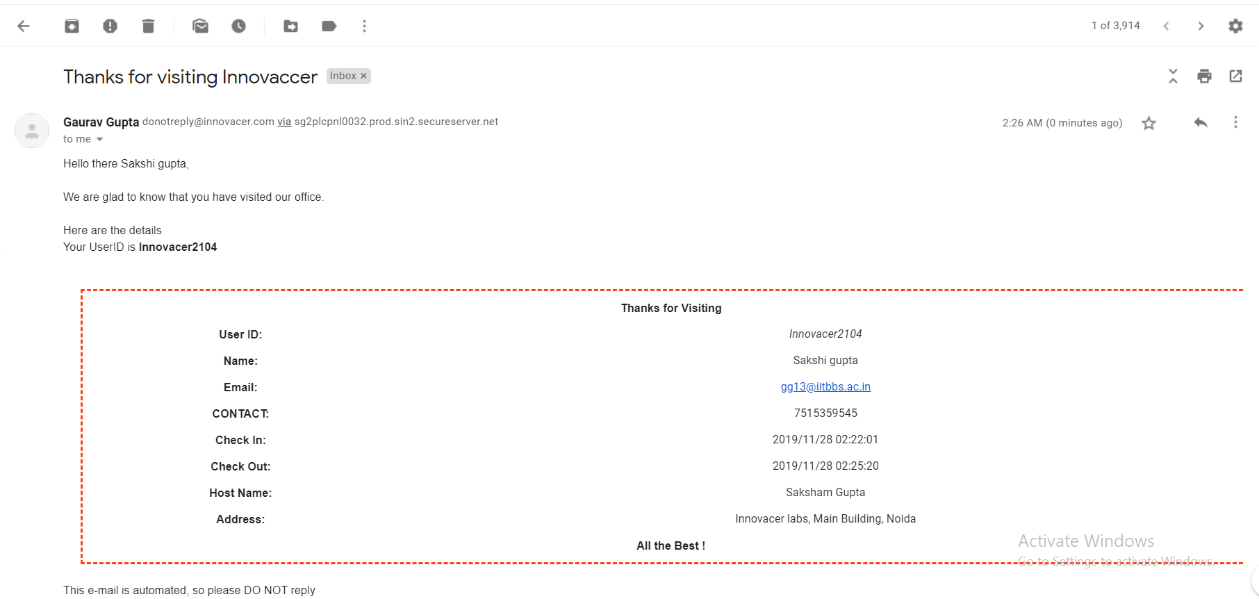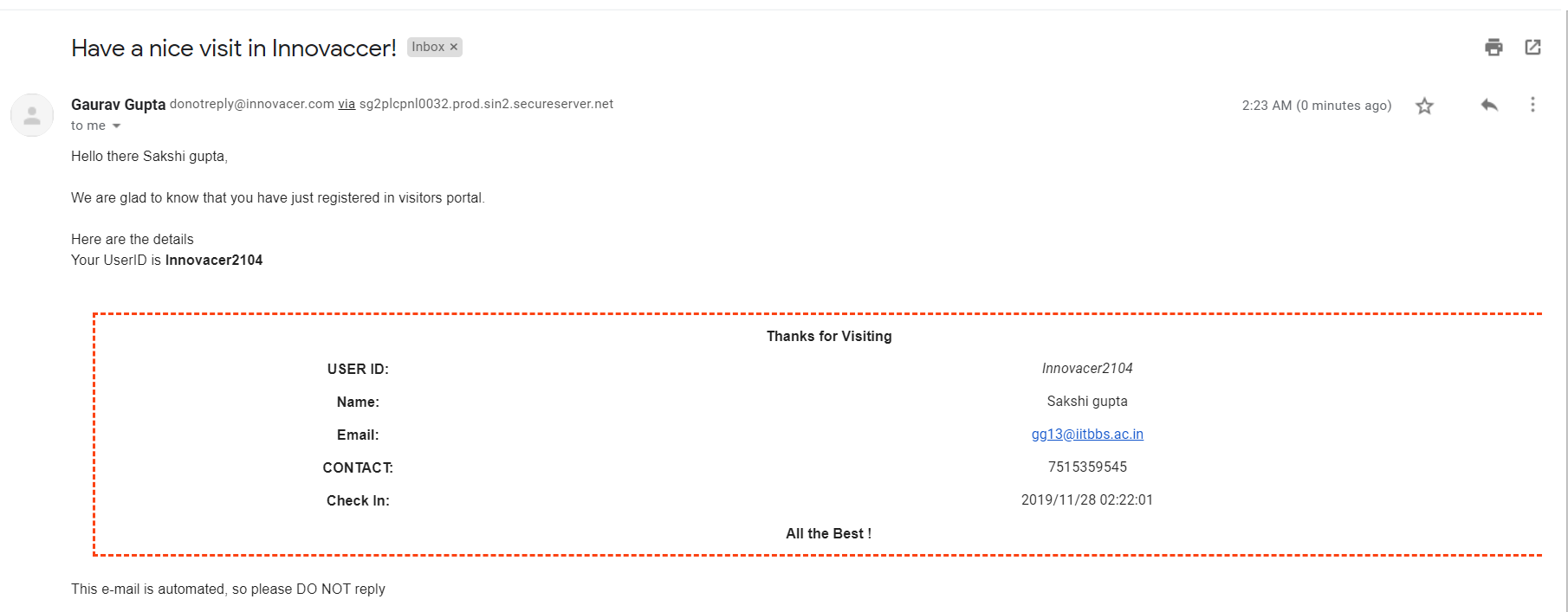 - He will receive a mail with his unique UserId. In the meantime, Visitor's host will also receive a mail that a guest has arrived for him.