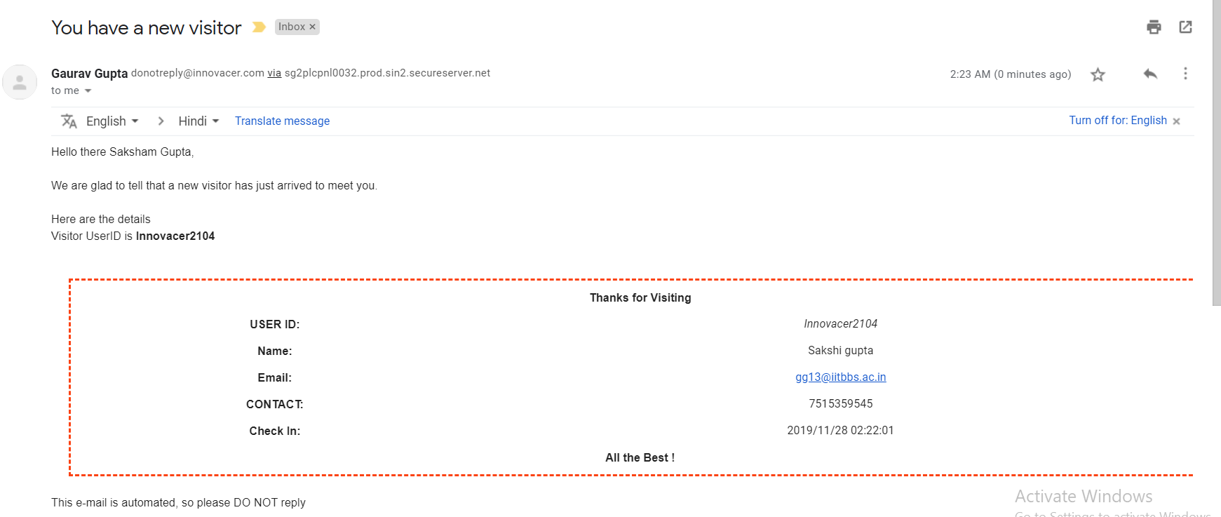 Once Anant checks in and enters his details in the application, Vishesh should get an email stating the visitor details, and also Anant gets an Email with his UserId which will be required during Check Out.