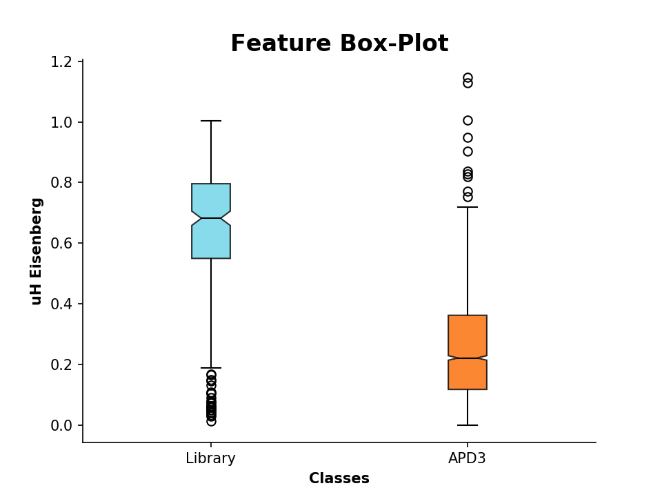 >>> plot_feature([D.descriptor, APD.descriptor], y_label='uH Eisenberg', x_tick_labels=['Library', 'APD3'])It is also possible to plot 2 or 3 different features in a scatter plot: