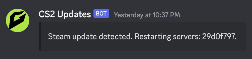 Once configured, you simply leave the bot running. It will periodically check every ~2 minutes for Counter Strike 2 updates and perform restarts as needed. Please not that it doesnt update on every change that Valve releases for CS2, only the ones that will stop players connecting to your server.