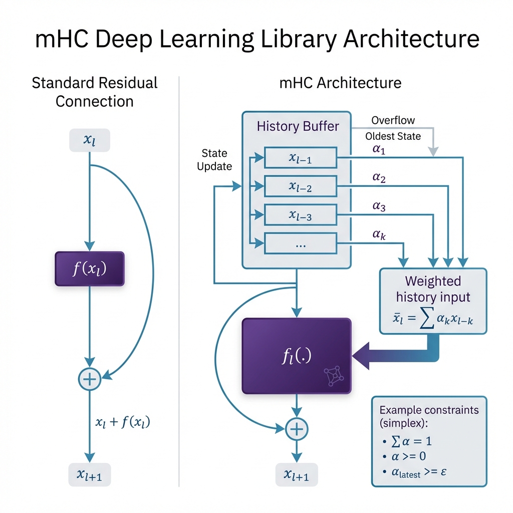 mhc is a next-generation PyTorch library that reimagines residual connections. Instead of simple one-to-one skips, mHC learns to dynamically mix multiple historical network states through geometrically constrained manifolds, bringing Honey Badger toughness to your gradients.