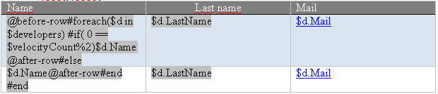 @before-row#foreach($d in $developers) #if( 0 == $velocityCount%2) | $d.LastName | $d.Mail