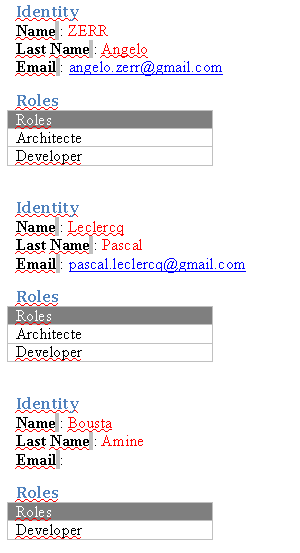 Identity Name : $d.Name Last Name : $d.LastName Email : $d.Mail Roles