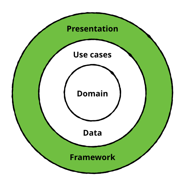 - Presentation / framework - Would include both domain and data layer and is android specific which executes the UI logic.