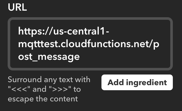 Enter your URL: https://us-central1-mqtttest.cloudfunctions.net/post
