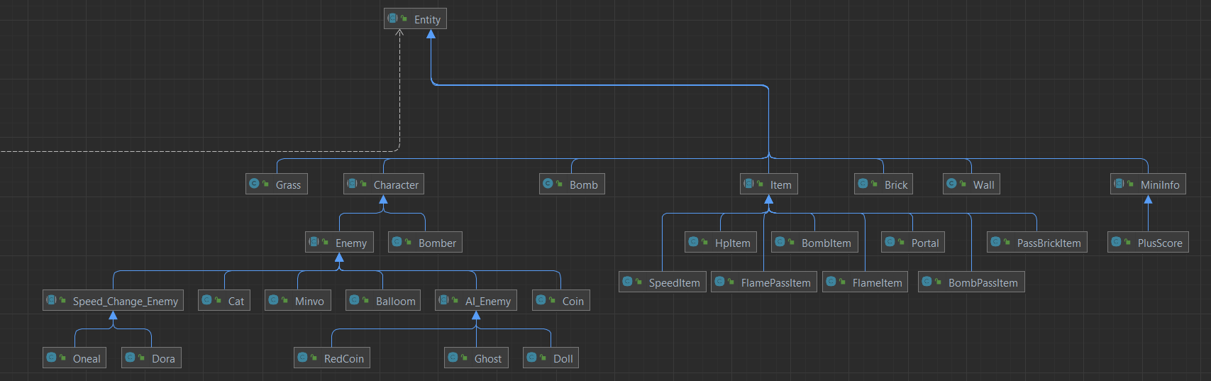 Nếu bạn đã từng chơi Bomberman, bạn sẽ cảm thấy quen thuộc với những đối tượng này. Chúng được được chia làm hai loại chính là nhóm đối tượng động (Bomber, Enemy, Bomb) và nhóm đối tượng tĩnh (Grass, Wall, Brick, Door, Item).