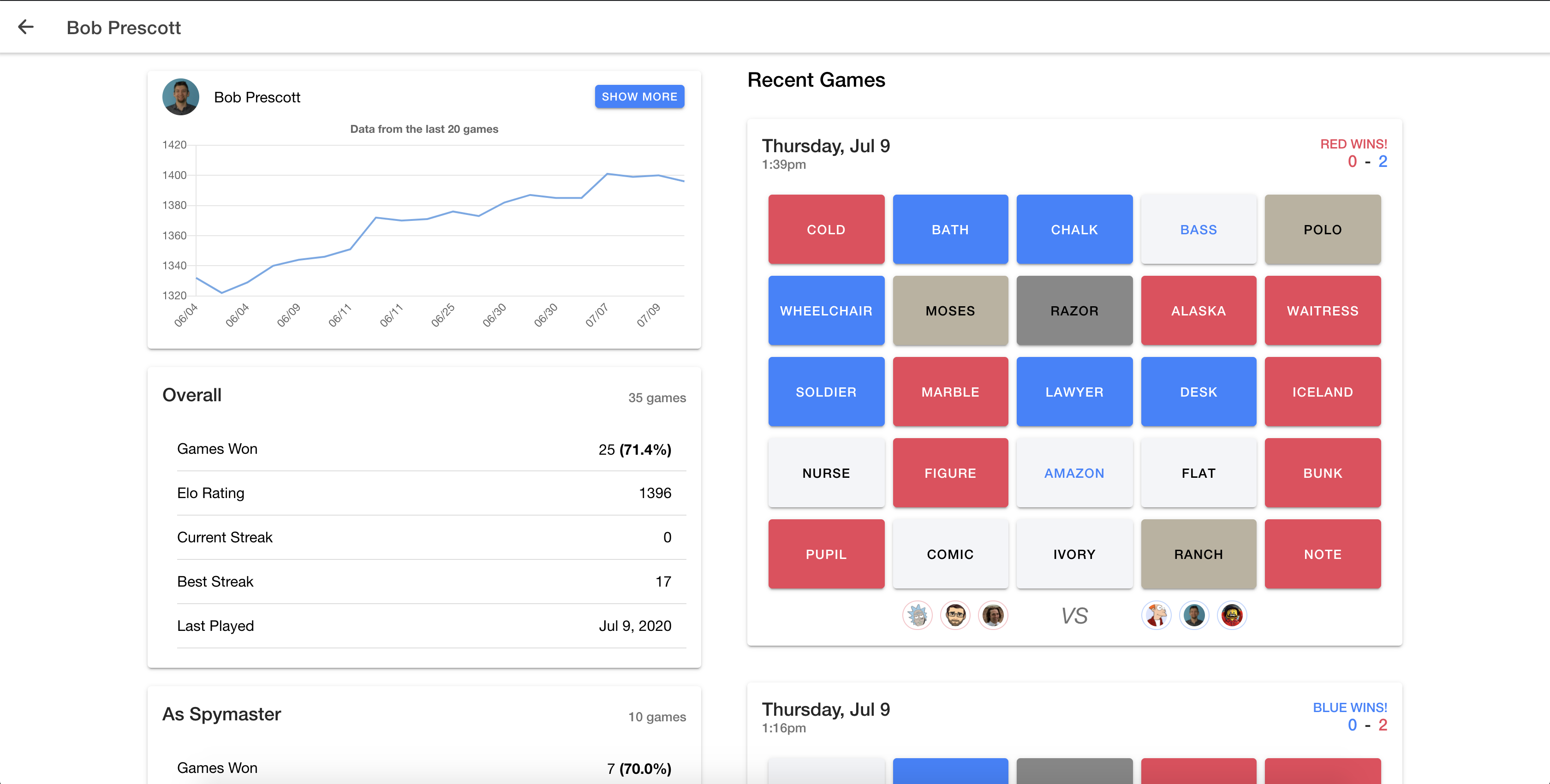 CodeTango is the result of a hackathon at Tango Card on 6/26/20 but is still actively being developed. To play, you enter a room code from the home page and are then prompted to log in (if you are not already logged in). You are required to have a Google account to play on CodeTango. Once signed in, and you have enough players to play a game, you can assign teams, pick a spymaster, and begin playing. After each match, statistics are calculated, and you can view these from the leaderboard pages or individual user scorecard pages. You can scroll back through the game history as well to see all completed games that affect your stats. You can also view all games played on CodeTango here.