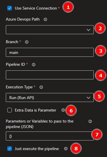 - Extra Data is Parameter (optional): Indicates if additional information will be sent to the pipeline to be executed. If "true" (selected), it will be sent as a parameter; if "false", it will be sent as a variable.