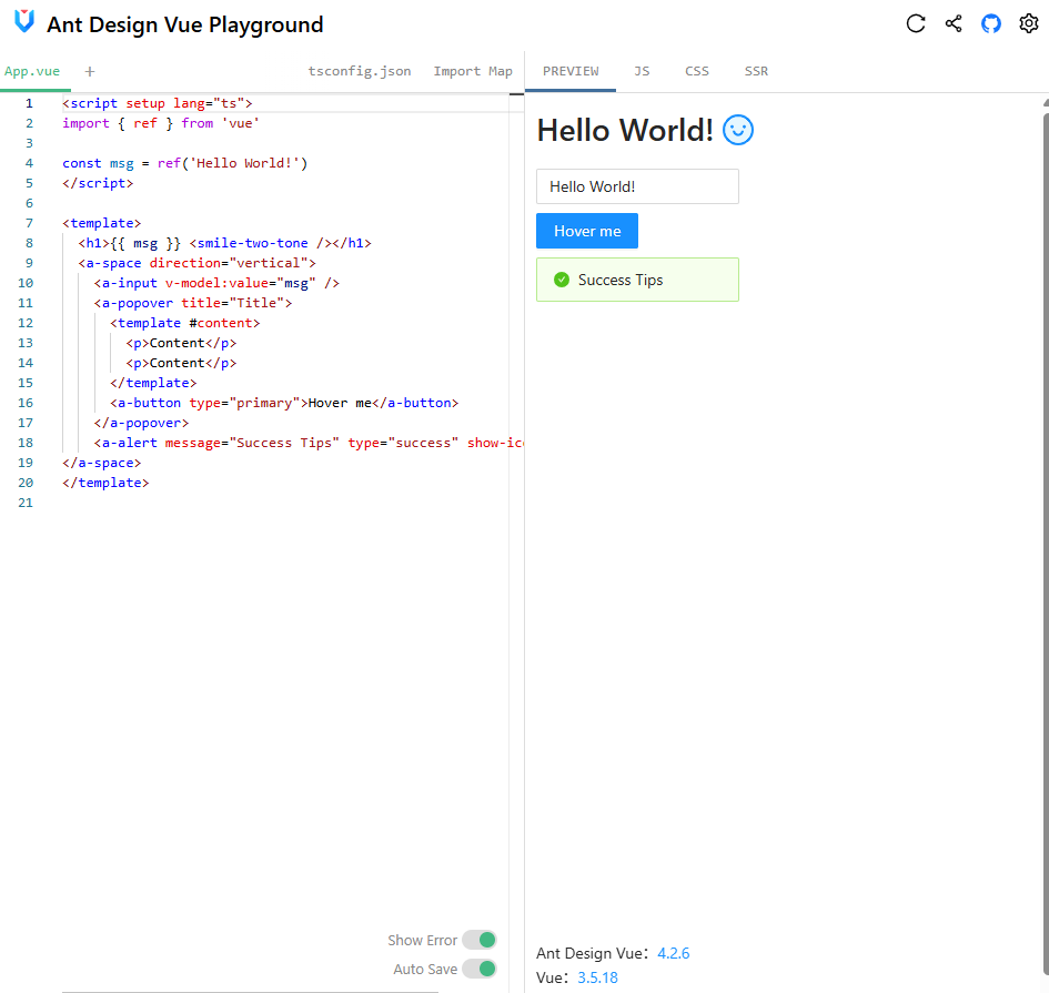 在线实时编辑和预览 Ant Design Vue 组件,无需安装任何依赖!