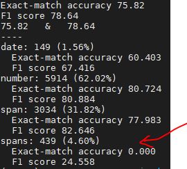 As shown above, all things go well but model performs really poor on multi-spans cases. I checked the output file (predictions.json), and I did not find a multi-spans prediction.