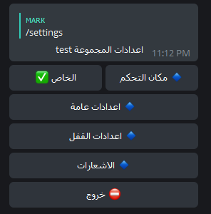 اعدادات البوت في المجموعة-- عند ارسال الامر "اعدادات" & "settings" يرسل البوت رسالة في الخاص تحتوي على