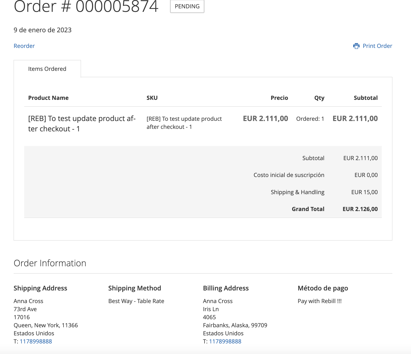 2- Modificar la dirección del customer para que tome otro valor en la recurrencia (por ejemplo, cambiar de New York a Alaska)