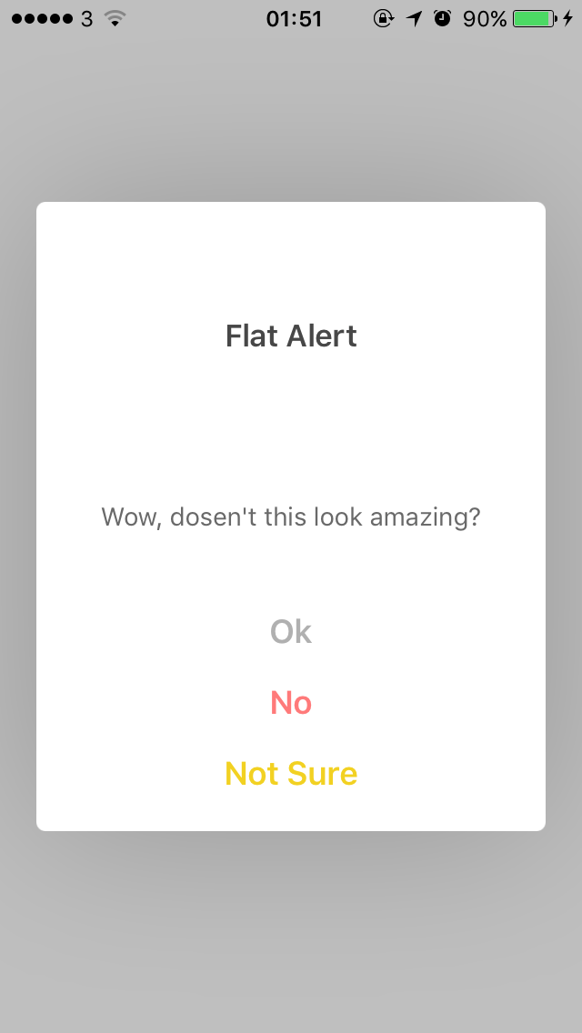 let alert = FlatAlert(title: "Flat Alert", message: "Wow, dosen't this look amazing? I am completely astonished by this work that I must donate via PayPal immediately!", style: .alert)